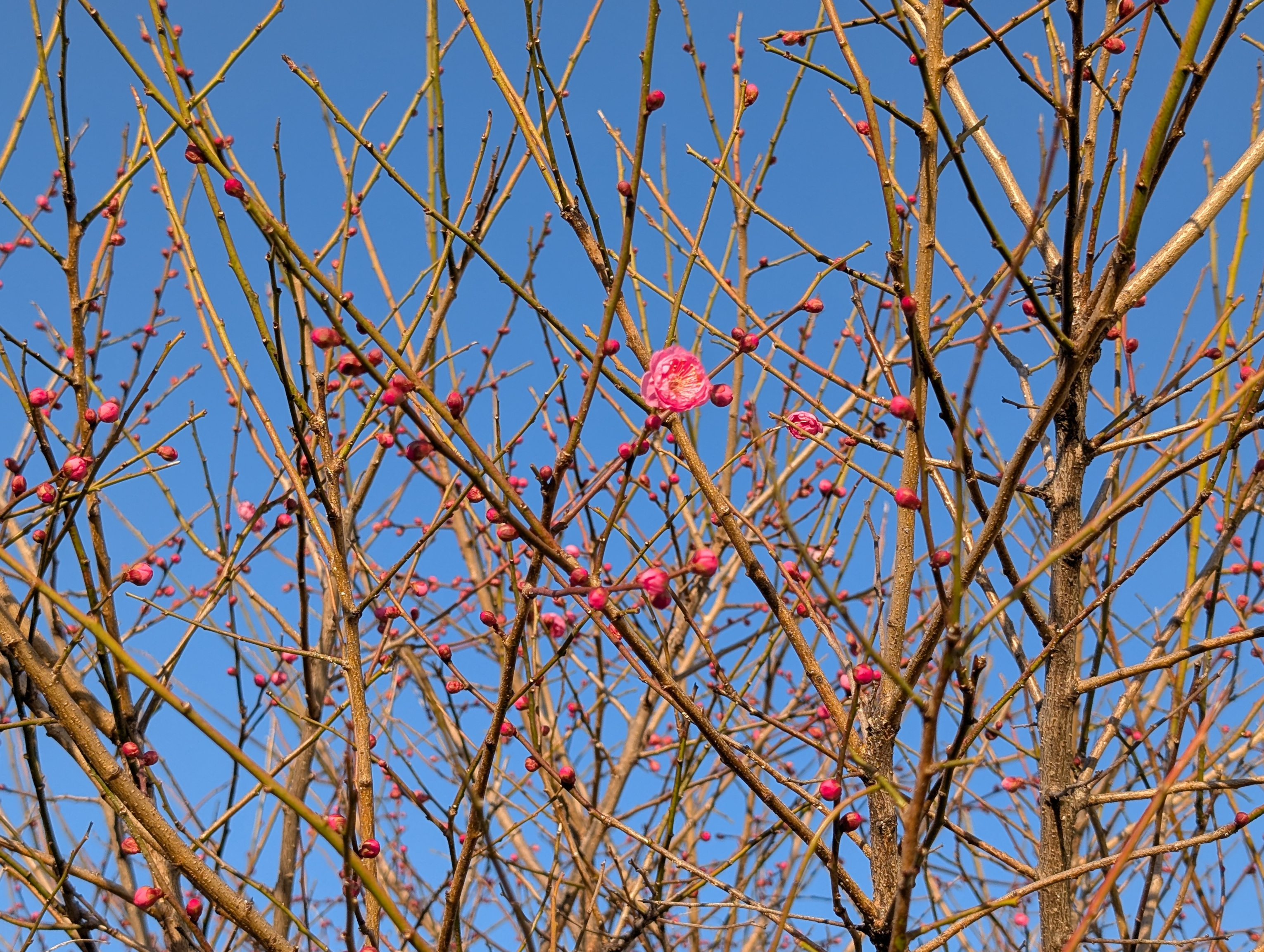 梅のつぼみが赤く膨らんできました